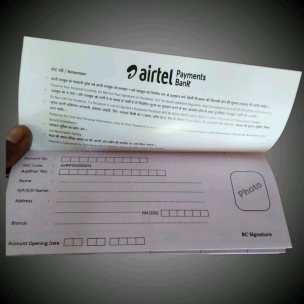 The Airtel Payments Bank Passbook helps customers and banking agents maintain an accurate record of all transactions such as deposits, withdrawals, and balance updates. It is ideal for Airtel Payments Bank branches, Customer Service Points (CSPs), Business Correspondents (BCs), and retail banking outlets.