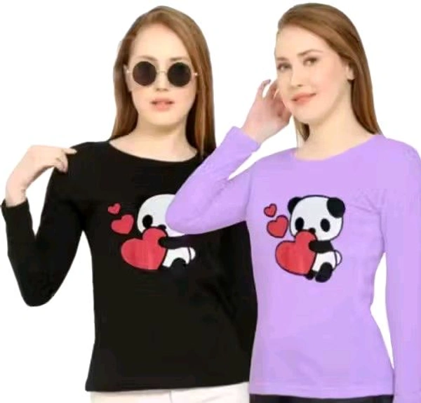 "Cute Panda Love Print Women's Full Sleeve T-Shirts - Pack of 2 (Black & Lavender)"women's T-shirts, cute panda print, full sleeve T-shirts, printed T-shirts, round neck, love heart print, black and lavender tops, graphic tees for women, soft cotton blend, trendy casual wear, pack of 2 T-shirts