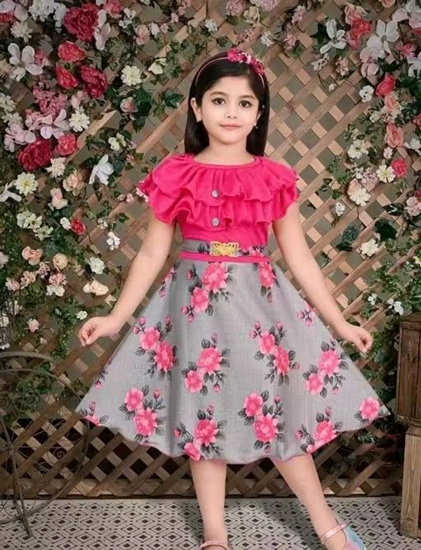 Pink colors flower printed soft cotton blend fabric knee length fit and flare dress.A black belt is provided with this frock.This many sizes are available 0-3 months kids to 11-12 years girls.