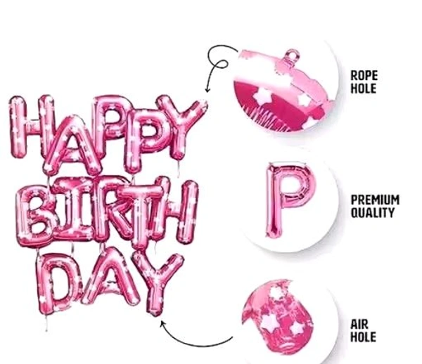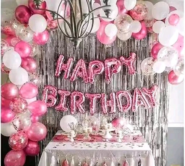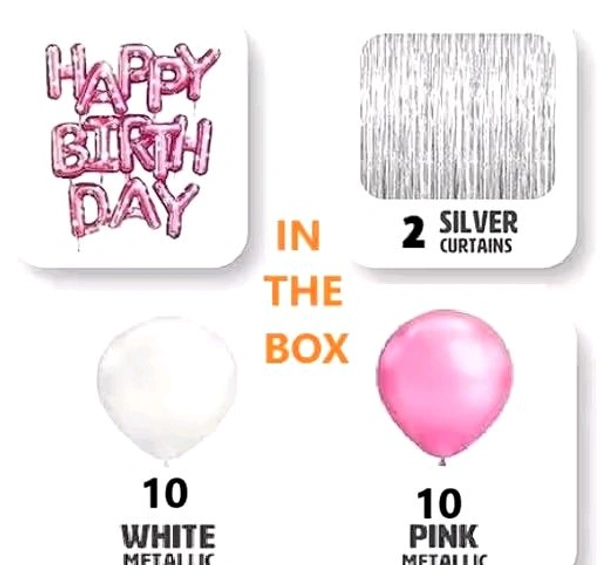 Name: Set of 35 Pcs Happy Birthday Decoration Kit Combo - Pink Happy Birthday Letters , Silver Curtains , Pink & Silver Metallic Foil Balloons Theme